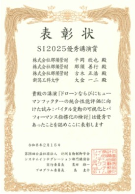 2025年12月10日~12日に開催された第26回計測自動制御学会システムインテグレーション部門講演会(SI2025)において、本事業の成果を利用した共同研究『ドローンならびにヒューマンファクターの統合性能評価に向けた試み ―バイタル変動の可視化とパフォーマンス指標化の検討―』と題した論文投稿・講演を行い、優秀講演賞を受賞しました。
